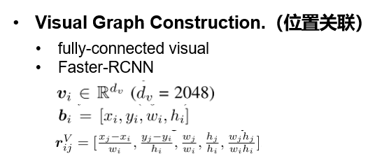 具体来说,视觉图包含了图像中的物体及其位置关系的表示。构造原理是通过训练好的目标检测模型比如Faster-RCNN得到图像中物体的集合,并构造全连接图。其中每个实体由一个2048维的视觉特征向量和4维空间特征向量,以及对应的label进行表示,而每一条边则用与两端节点位置相关的五维特征向量表示。