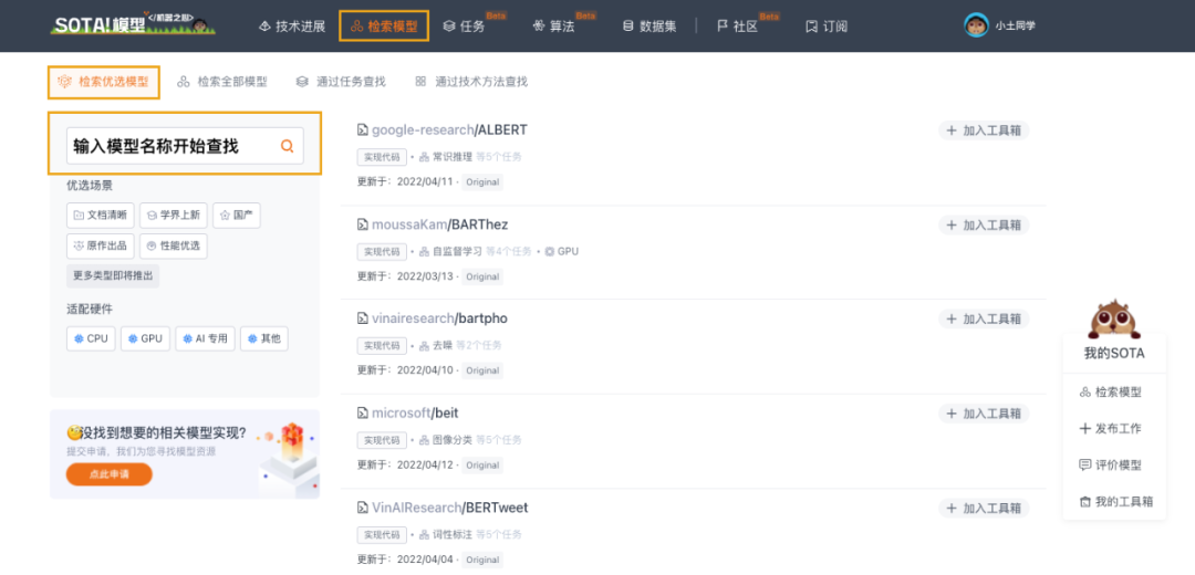 机器之心的老伙计们可通过上述链接直接访问,也可以通过「 SOTA!模型」平台上检索模型中的检索优选模型功能检索获取自己想实现的主流模型资源。在检索框输入模型名称即可查找。