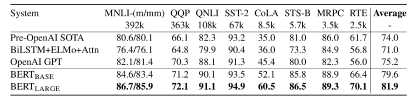 BERT 在 BooksCorpus 和英文维基百科组成的大规模语料上进行预训练。预训练后,模型通过 fine-tuning 的方式与具体任务结合,在 11 个自然语言处理任务上超越了之前的最佳结果。