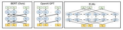 图 | 预训练语言模型间的差异 BERT 的 Transformer 使用了双向的自注意力机制(self-attention),OpenAI GPT 使用的是由左到右的 Transformer。ELMo 则使用了两个不同方向的 LSTM,将其输出结果拼接在一起。(来源:arXiv)