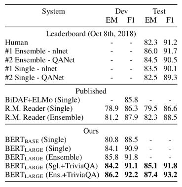SQuAD v1.1 是斯坦福公开的阅读理解问答数据集。该数据集上的任务为,给定一段文本和一个问题,需要从文本中摘取一个片段作为问题的答案。在这一任务上,BERT 不仅超越了之前提交的各个模型的最好成绩,其 F1 值更比人类的表现高出两个百分点。