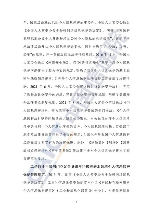 白皮书中内容指出,从2012年开始到2021年,国家陆续推出并施行了《网络安全法》《数据安全法》《个人信息保护法》,意味着当前国家关于个人信息保护法律制度的顶层设计基本形成,而在针对行业领域个人信息保护方面,相关管理规定也在积极的推进过程之中。
