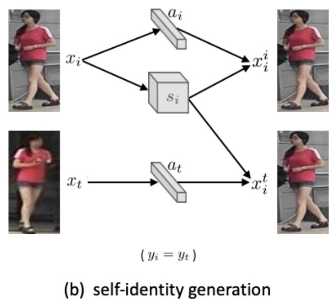 我们可以有一个自我重构的loss(上方,类似auto-encoder),还可以用同ID的postive sample来构建生成图像。这里我们用了pixel-level的L1 Loss。