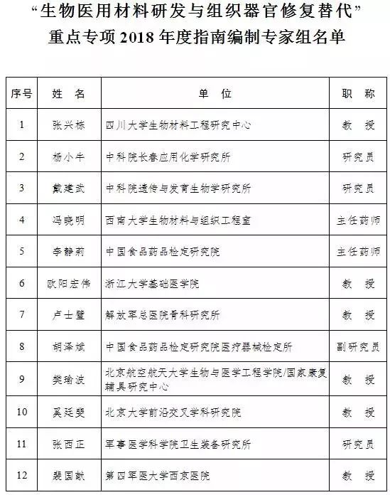 “生物医用材料研发与组织器官修复替代”重点专项2018年度项目申报指南