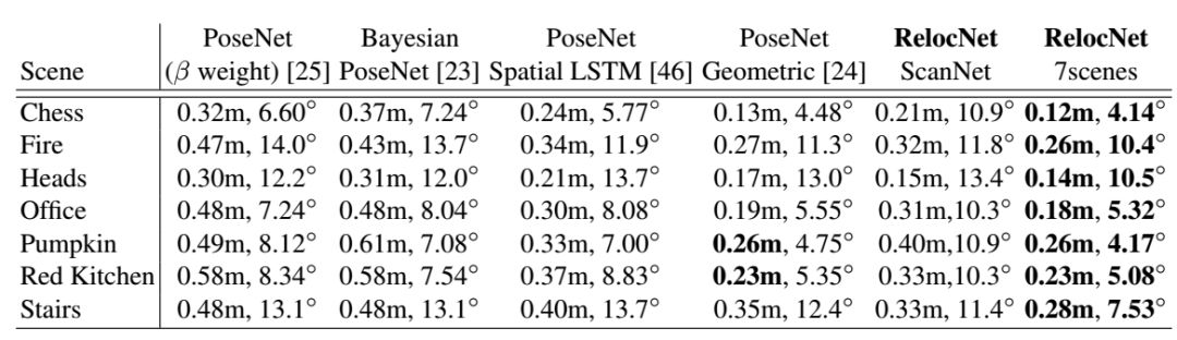 可以观察到,即使测试集和训练集完全不同,我们的RelocNet(倒数第二列)也优于原始版本的PoseNet。这表明我们的方法在不同数据集间的具有可移植的潜力。此外,当训练集和测试集相同时,我们的方法表现最优。最后,值得注意的是使用时间信息(LSTM)带来的性能提升依然小于使用我们的方法。