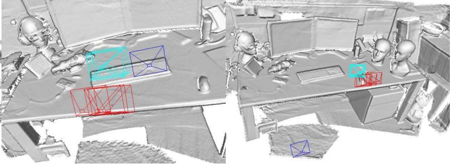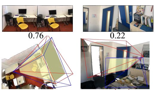 图4 定性结果。 图中蓝色为真值的视锥,红色为检索得到的最近邻视锥,青色为网络估算得到的位姿所对应的视锥。可以看到,我们估算的结果(青色)比最近邻更接(红色)近真值(蓝色)。第二列为失败案例,因为最近邻视锥与真值相差太远。