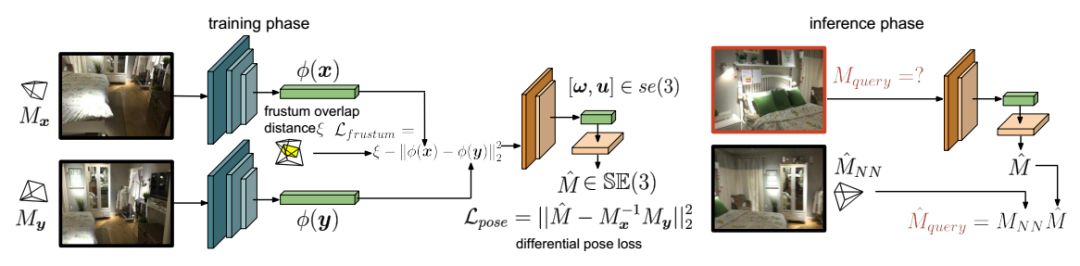 图1左为训练阶段。使用Siamese架构(偏蓝色的网络)来训练全局特征描述符φ,该描述符的学习由基于相机视锥重叠的连续度量学习损失函数Lfrustum驱动,这样会强制学习到的描述符与细粒度的相机位姿检索相关。后续的网络层(偏黄色的网络)用来根据两个输入推断位姿差异。