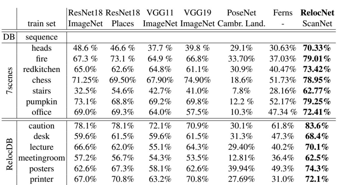 表1中显示了在7Scenes和RelocDB数据集中,视锥重叠阈值设为0.7时的重定位成功率。可以看到,我们的描述符在重定位方面,明显优于其他方法,匹配成功率大致在70%。