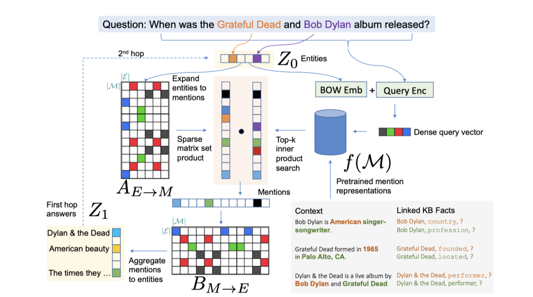 上图表示DrKIT通过迭代地将输入实体集X(The Grateful Dead, Bob Dylan)映射到输出实体集Y(Dylan&the Dead, American beauty ,...)来回答多跳问题的过程,Y依据关系R(album by)和输入实体集相关。