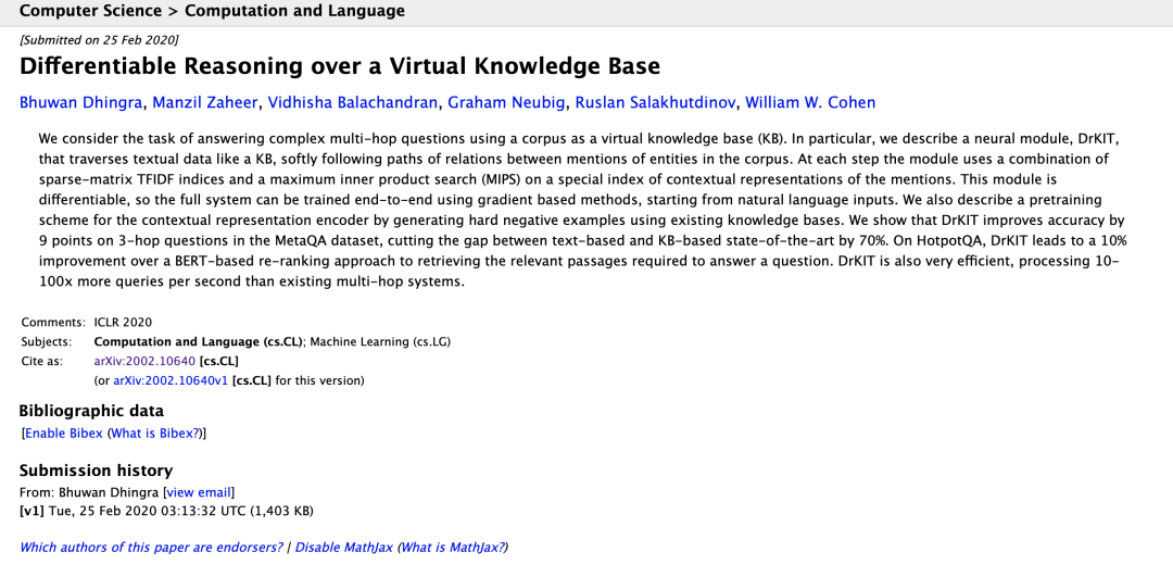 对于知识图谱的研究在最近几年呈现逐渐热门的趋势,在今年的ICLR2020上,就涌现出了大量相关研究,其中,来自CMU和Google的研究者提出了一种新的将语料库作为虚拟知识库(Virtual Knowledge Base,KB)来回答复杂多跳问题的方法,其可以遍历文本数据,并遵循语料库中各个实体的关系路径,并基于评分的方法,实现了整个系统端到端的训练。实验结果证明此模型可以快速地实现更好的性能。