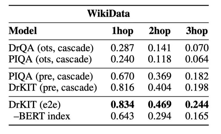 实验结果说明,DrKIT的准确率超越了前人的方法,在2跳和3跳问题上表现出了尤为突出的性能。
