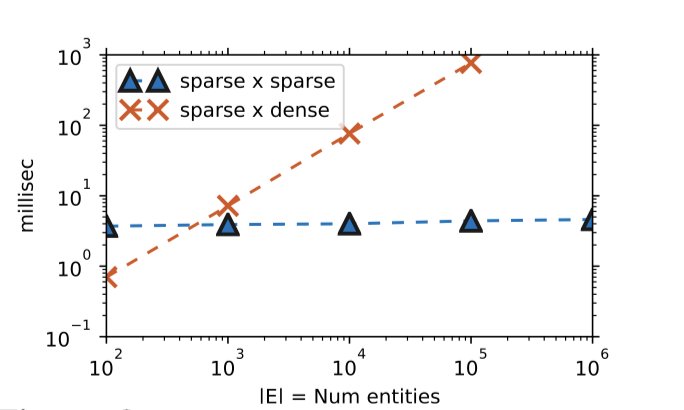 其中:上式中每个操作都是存在于稀疏矩阵和向量之间,并可以微分 :我们将在下一部分(第二部分)讨论此过程的高效实现。此外,因为我们在基于TFIDF的扩展过程中,将其过滤为了top-K相关提及(在上式中的元素对应乘积部分),同时,每个提及只能指向