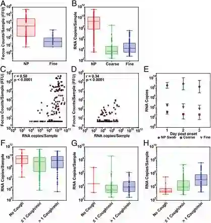 对这些样品中分离的传染性病毒的分析表明,大量流感患者经常性地将感染性病毒(不仅是可检测的RNA)排放到足够小的悬浮颗粒中,造成空气传播的风险。令人惊讶的是,来自没有咳嗽的患者的23个细小的悬浮颗粒样本中有11个(48%)检测出病毒RNA,并且这11个中有8个含有感染性病毒,表明在没有咳嗽的情况下,悬浮颗粒也会携带感染性物质。另外还观察到,不管悬浮颗粒大或小,打喷嚏少并不会使颗粒携带的病毒RNA拷贝数更多,这表明打喷嚏对悬浮颗粒中的流感病毒脱落不起重要作用。