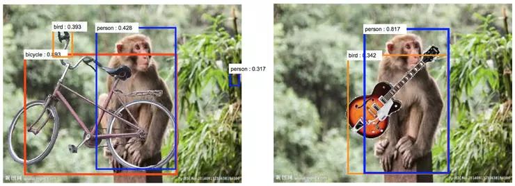 第三,深度学习对于图像中的变化过于敏感,人类则难以被欺骗得多。我们不仅已经知道标准的对抗性攻击可以对图像做出人类无法感知的微小改变,但可以让深度神经网络的识别结果发生彻底的变化,同时神经网络还对背景环境的变化过于敏感。下图中,研究人眼们把不同的物体拼贴到一张森林中的猴子的照片上。这会让深度神经网络把猴子误识别为人,同时也把吉他误识别为鸟,我们猜测这大概是因为「拿着吉他的更有可能是人类而不是猴子」以及「树林中的猴子周围更有可能出现一只鸟而不是吉他」。深度神经网络记忆相关性的能力在此时反倒成了累赘。近期有许多研究都挖掘了深度神经网络对于背景环境变化过于敏感的问题。