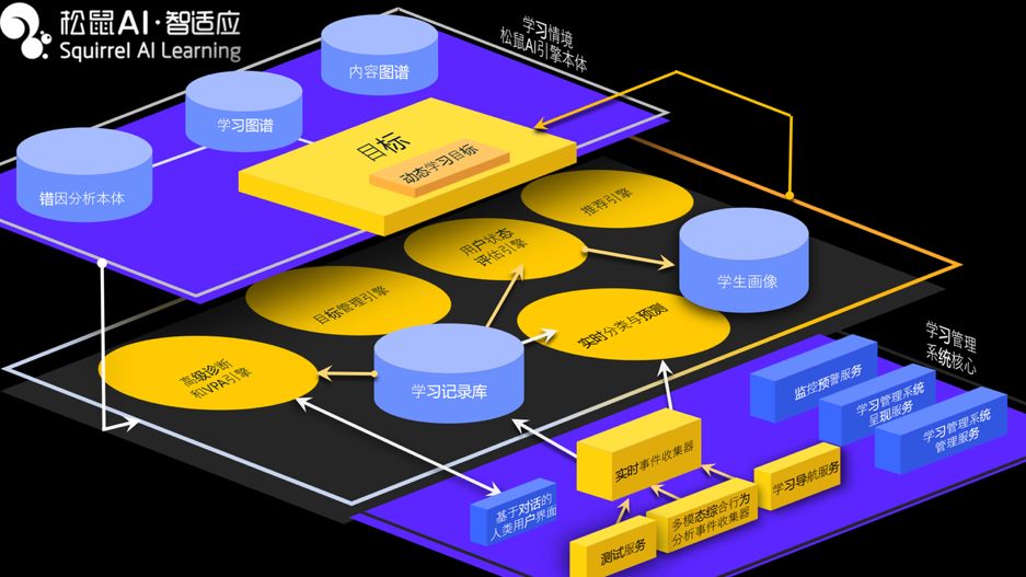第一层是人脑的一个记忆功能,包括学习目标的本体、学习内容的本体和错因分析本体;第二层是计算引擎,包括智适应推荐引擎,实时分类和预测引擎,以及目标管理引擎等等;第三层是类似于人的眼,能够和学生实时的交互,包括管理系统,检测预警系统和实时的事件收集器。