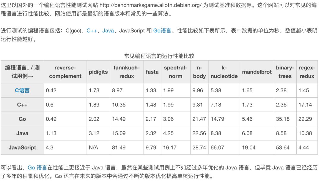 虽然Go号称兼备C++的运行效率和PHP的开发效率,但benchmarks好像并不支持这个结论,数据有点打脸,Go的运行效率接近却略低于Java。