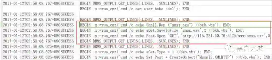 在tns日志中,oracle相关存储得到入侵者相关的存储利用。如downfile‐smss.exe,地址为115.231.60.76