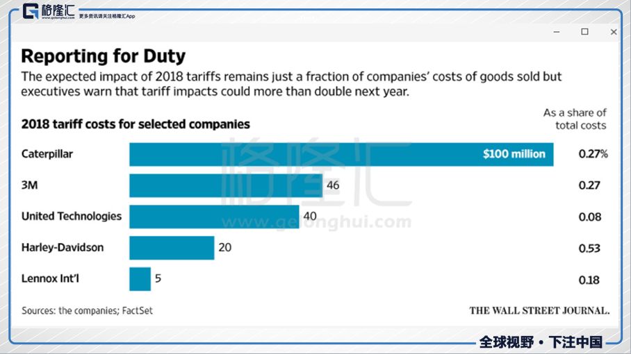 卡特彼勒称贸易战增加了它的采购成本,2018年就已经公布业绩的公司来看,关税成本还不明显,但CEO们普遍警告明年关税成本可能翻倍。像联合技术的CEO,称公司2018年关税成本预计为5300万美元,而2019年可能上升到1.6亿美元。