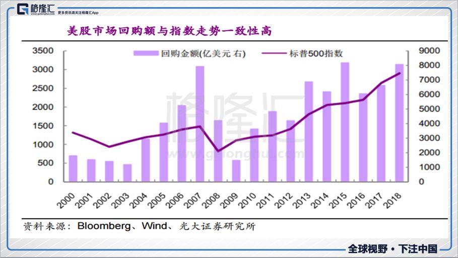 根据光大证券的统计数据,2003-2007年,美国市场回购金额从1178亿美元上涨至7920亿美元;2009年-2018年,美股市场回购金额是1472亿美元上涨至8064亿,这个回购体量是相当大的。
