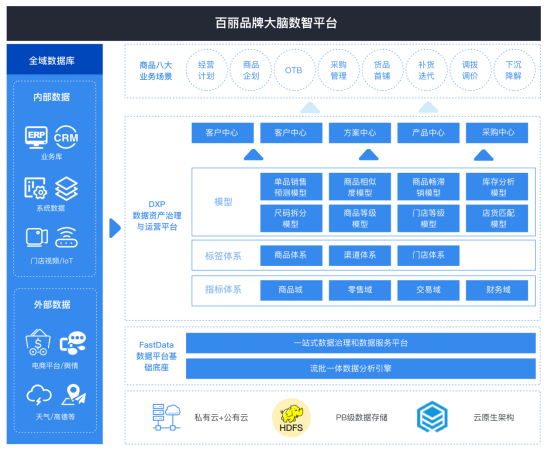 在采访中,杨磊以滴普科技的零售行业客户百丽国际为例,介绍了零售数据密集型企业应用湖仓一体后的真实收益。以往百丽国际已有七大数据仓库,数据分布在CDH/DB2/MySQL/Oracle等 OLAP 数据库中,数据量超过 3PB,全量计算需要耗时数天。滴普科技为百丽国际完成核心大数据组件升级,从原来的 Hive、Spark、离线计算等技术,升级为FastData-DLink、FastData-DCT、FastData-DataFacts,整合原有 7 个数仓平台形成湖仓一体实时架构。统一数仓后,分析时间从 T+X 缩短为 T+0,实现门店级到区域级到集团级实时数据分析能力,提升业务响应的敏锐度,与此同时,也节约大量传统数仓的技术运维成本。