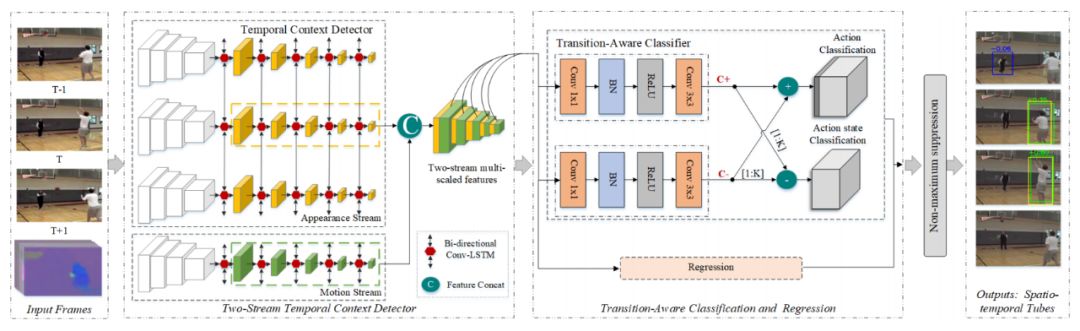 上述发现开启了本文工作。具体而言,旷视研究员提出一个过渡感知上下文网络——TACNet,它包含两个核心组件,即时序语境检测器和过渡感知分类器,前者的设计是基于标准的 SSD 框架,但是通过嵌入若干个多尺度的双向 Conv-LSTM 单元可以编码长期的语境信息(据知,把 Conv-LSTM 和 SSD 相结合,以打造一个用于动作检测的训练检测器,这是第一次);后者则通过同时分类动作和动作状态,以区分过渡性状态。