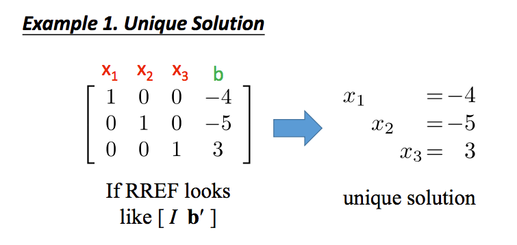 如果简化行阶梯形式是[I;b']的,那么线性方程组有唯一解: