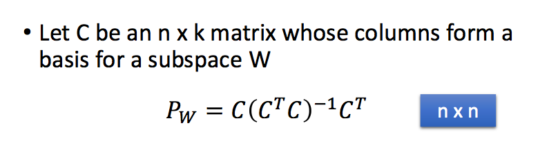如何得到一个向量在另一个子空间上的正交投影呢,从一个向量得到另一个向量,我们不妨中间乘了一个变换矩阵Pw,即w=Pwu。所以关键是变成如何寻找这个矩阵
