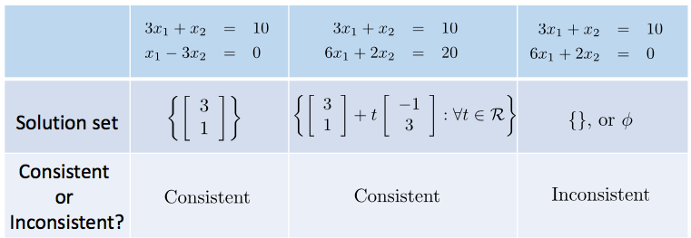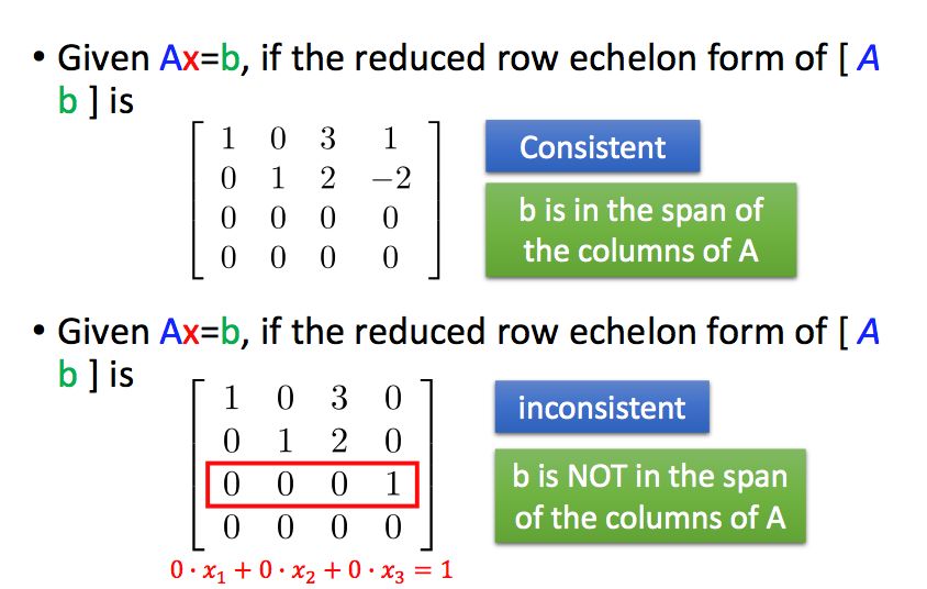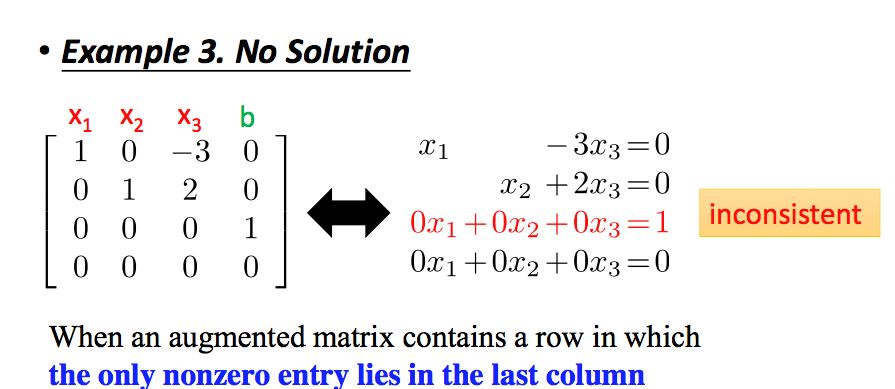 如果线性方程组有解,我们就称其为相容的(consistent),若无解,则称为不相容的(inconsistent)。