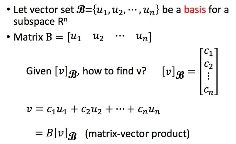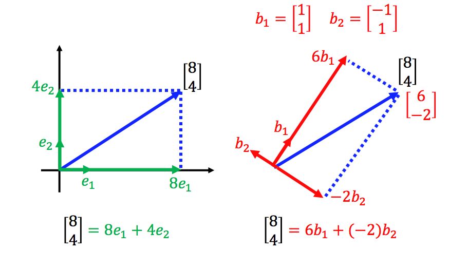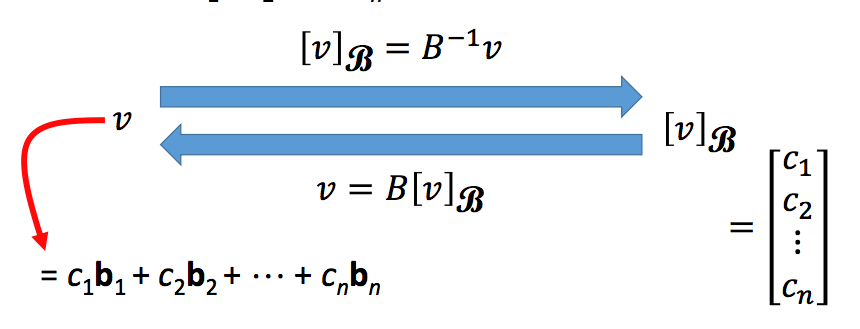 那么根据任意坐标系以及某一向量在该坐标系下的坐标,如何得到该向量呢?很简单,该向量可以表示成基的线性组合,系数即为其坐标:
