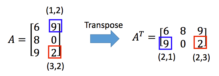 矩阵的转置:沿左上到右下的对角线为轴进行翻转,将(i,j)位置的元素与(j,i)位置的元素互换得到的矩阵,转置的矩阵用AT表示。