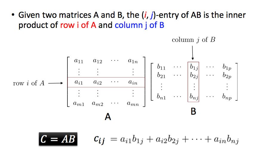 给定两个矩阵A和B,其相乘结果中的元素(i,j)是矩阵A的第i行和矩阵B的第j列的内积,因此,矩阵A的列数一定要个矩阵B的行数相等。