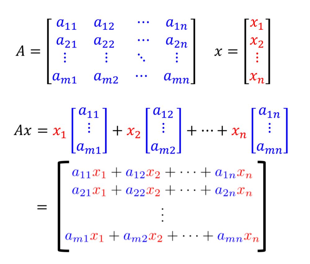 从列的角度来看矩阵和向量相乘:从列的角度看,矩阵A和向量x相乘,相当于对矩阵A的列向量做了一次线性组合。