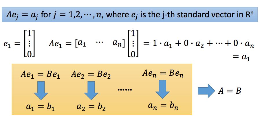 如果A和B都是m*n的矩阵,对所有的w,如果都有Aw=Bw,那么是否意味着A=B。结果是显然的。既然是所有的w,那么我们用标准向量就可以得到A和B的每一列都是相同的,因此A=B。