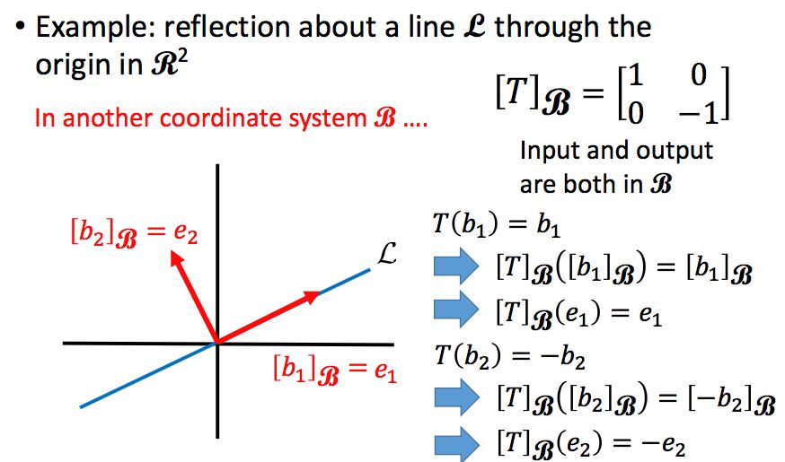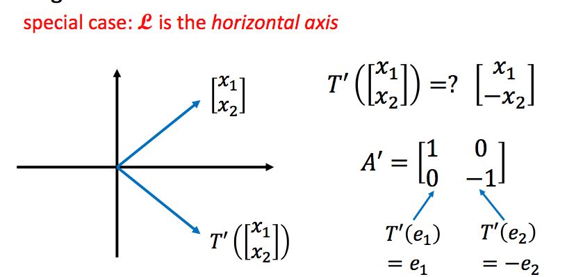 直接求解这个问题非常难,我们想要找的是一个矩阵A,使得T(x)=Ax,直线如果不是横轴或者纵轴的话,要找到这个矩阵A是十分困难的。但是如果直线是横轴或者纵轴的话,这个问题就变得非常简单。假设直线是横轴,那么要找的矩阵我们可以很容易写出: