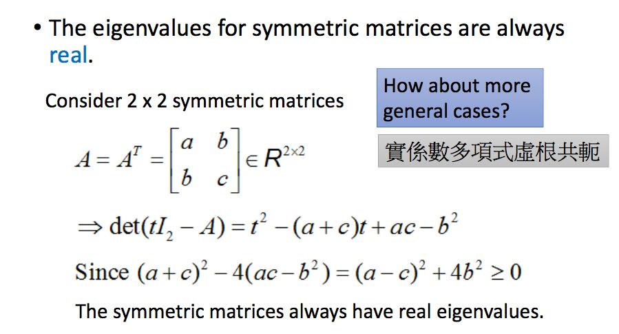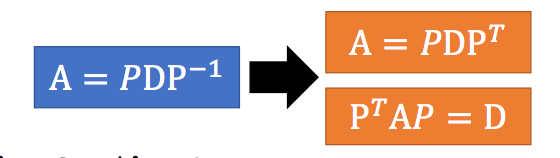 对称矩阵一定是可以对角化的(相关的证明网上可以找到,这里就不证明了),我们之前介绍过,对于一个可对角化的矩阵,它的特征向量之间都是线性无关的,根据这个性质,如果一个n阶对称阵有n个不同特征值的话,其对应的特征向量是两两正交的,那么其组成的矩阵就可以是一个正交矩阵,如果存在重根,其对应的特征向量之间不一定是正交的,但总是可以通过正交化的方式转换成正交的。因此对于对称矩阵来说,之前讲过的对角化的方式可以变为: