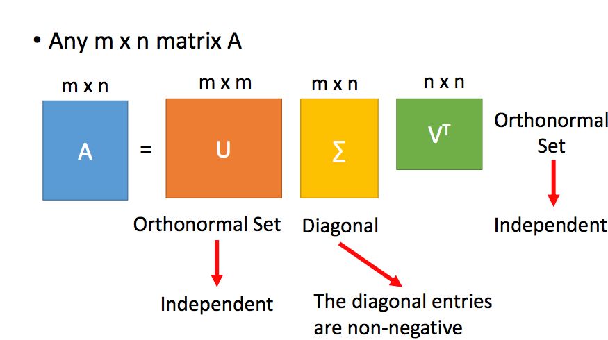 奇异值分解如下,一个m*n的矩阵A可以分解为一个m阶的正交矩阵,一个m*n的对角矩阵(类似于对角矩阵吧)和一个n阶的正交矩阵: