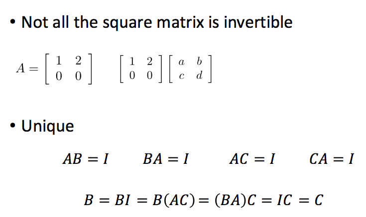 并不是所有的方阵都是可逆的。同时,一个矩阵的逆矩阵是唯一的: