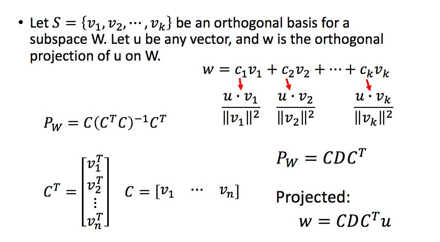 正交投影(Orthogonal Projection)通过下面的图片很容易理解,如果向量u像子空间W做正交投影,其投影的结果就是w。