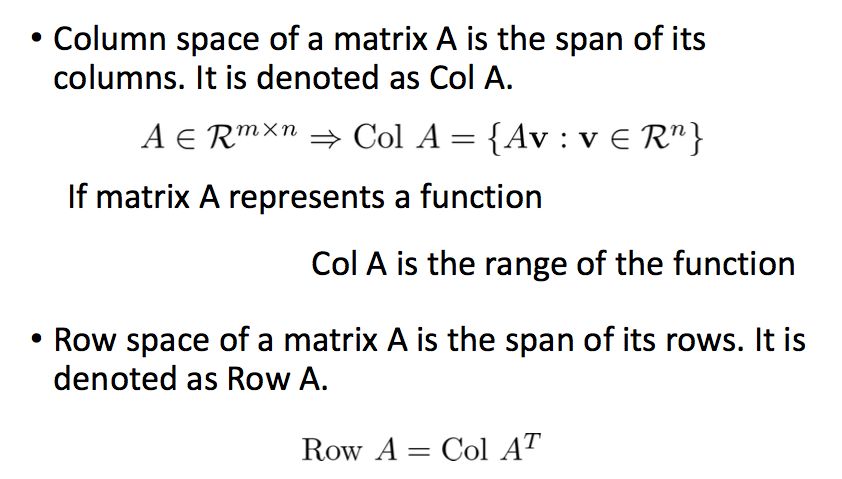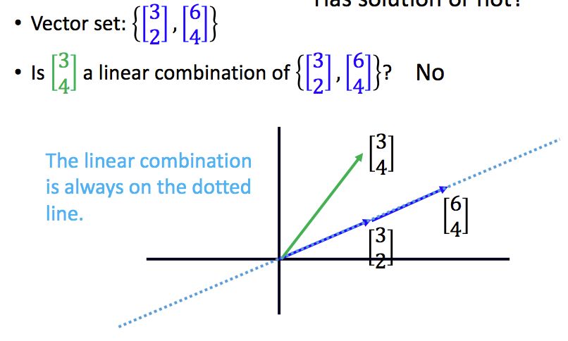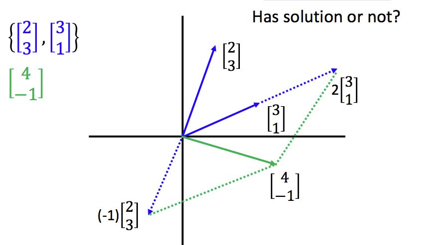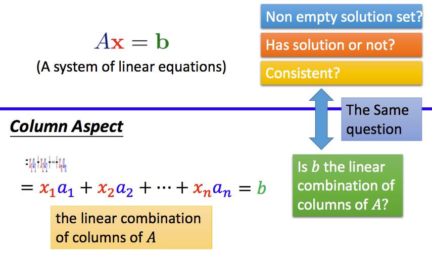 所以一个线性方程组的问题又可以转换成两一个等价的问题:向量b是否在A的列向量所张成的空间中?