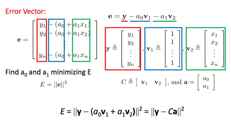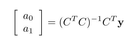 这里的C是我们的训练数据,训练数据的矩阵表示相当于线性方程组的A,要找的参数a相当于线性方程组的x,实际值y相当于线性方程组的b。根据我们上一节求解正交投影的方式,Ca的值应该等于y在C张成空间中的正交投影,因此,我们可以直接计算得到参数的值: