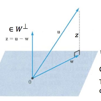 正交投影有一个很重要的性质就是,u在子空间W上的正交投影向量,是与u距离最近的,观察下图可以看出,直角三角形斜边的长度总是大于直角边的:
