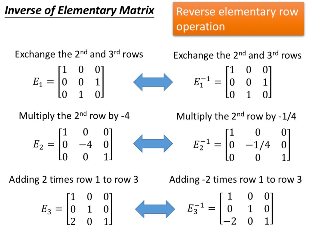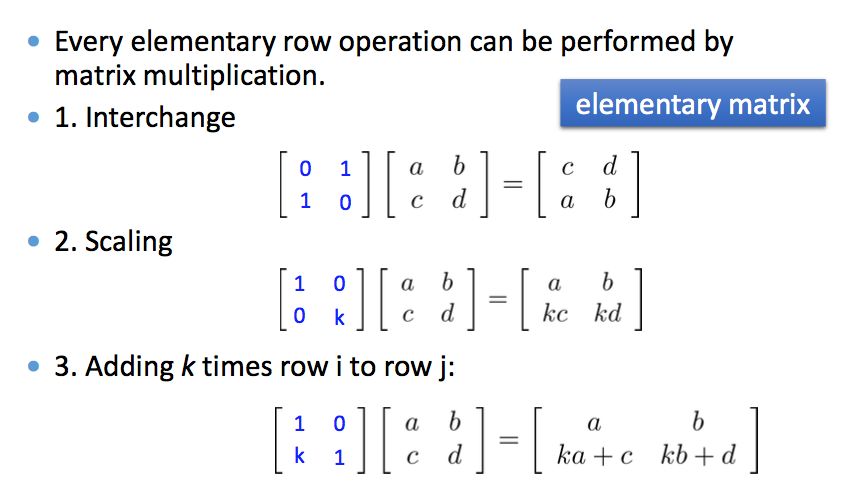 我们之前介绍了三种初等行变换,其实初等行变换都可以用矩阵相乘表示,这种左乘的矩阵被称作初等矩阵(Elementary Matrix)。即单位矩阵经过一次初等变换得到的矩阵。