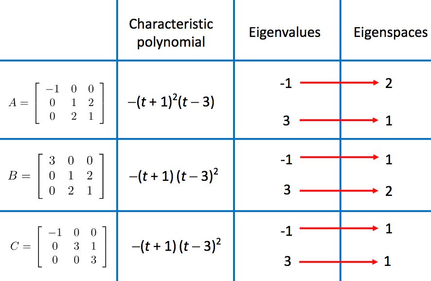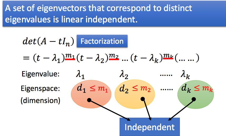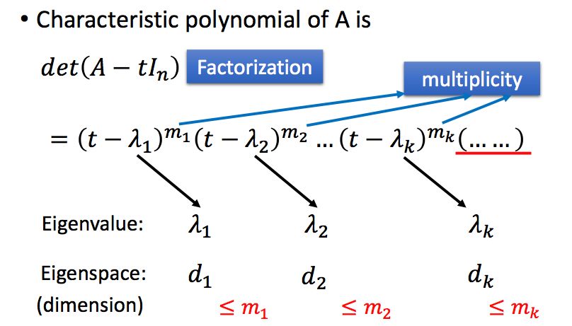 对特征多项式进行因式分解,我们可以得到如下重要的结论,一个特征值对应的特征空间的维度,小于等于该特征值重复出现的次数。