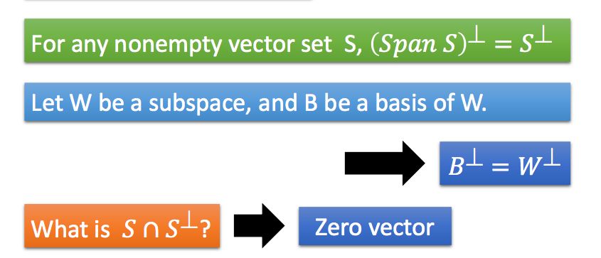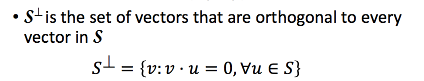 对于一个非空的向量集合S,该集合的正交补(Orthogonal Complement)定义为:
