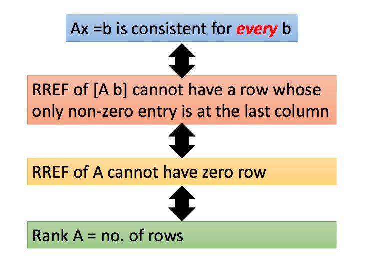 什么情况下Ax=b恒有解呢?b是一个m*1的向量,也就是说矩阵A的列向量可以张成整个Rm空间,即A的秩为行数m,也就是A变成简约行阶梯型之后没有全0行。