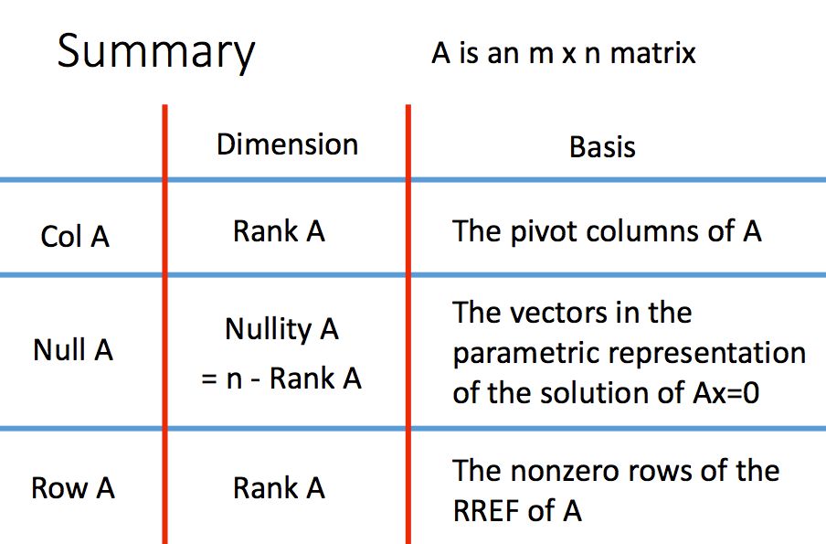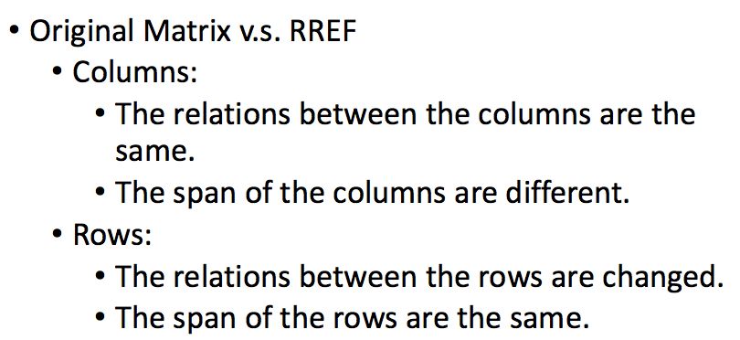也就是说,初等行变换不改变矩阵中列之间的关系。加入A的简约行阶梯形式是R,那么Ax=0和Rx=0有相同的解集。