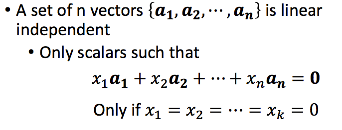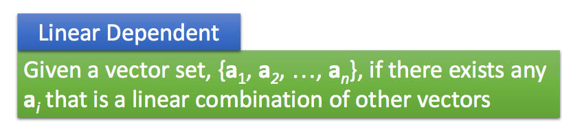 给定一个向量集,如果其中一个向量可以表示成其余向量的线性组合,那么我们就说这组向量是线性相关(Linear Dependent)的。值得注意的是,零向量是任意向量的线性组合,因此只要包含零向量的向量集,都是线性相关的。