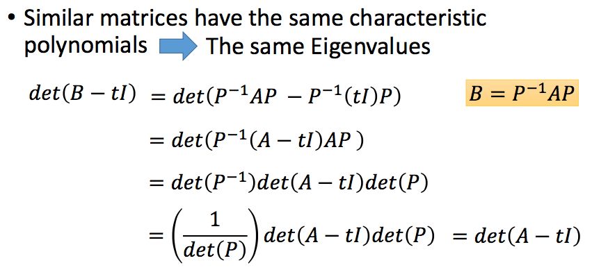 这里我们可以得到一个性质,两个相似矩阵的特征值是相同的,证明如下: