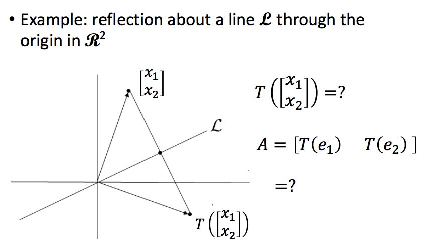我们举个例子来说吧,如果下图中的T表示得到任意一个向量关于直线L的对称向量: