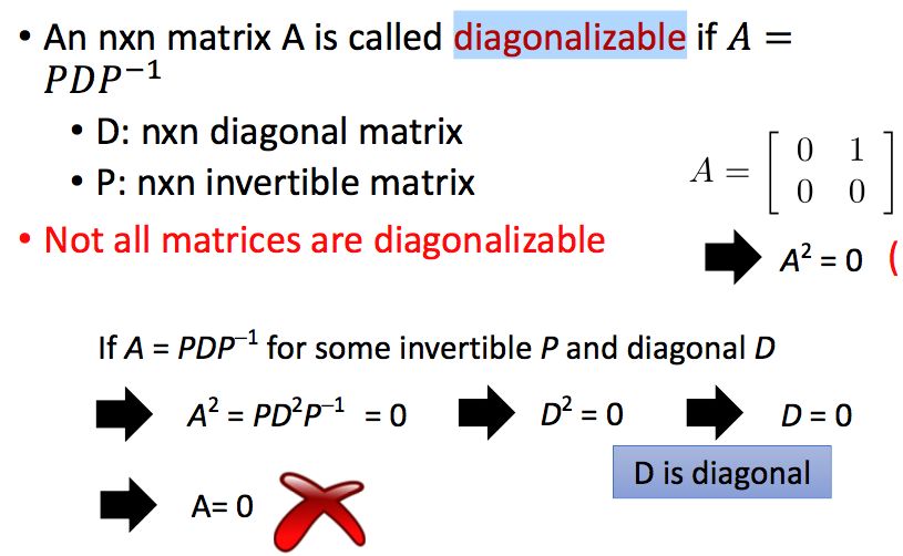如果一个n阶方阵A可以变为A=PDP-1,其中D是n阶对角矩阵,P是n阶可逆方阵,那么A就是可对角化的(diagonalizable)。但并非所有的矩阵都可以进行对角化: